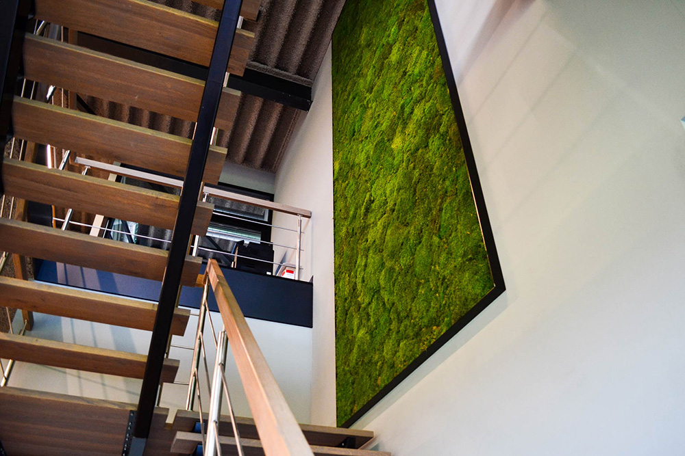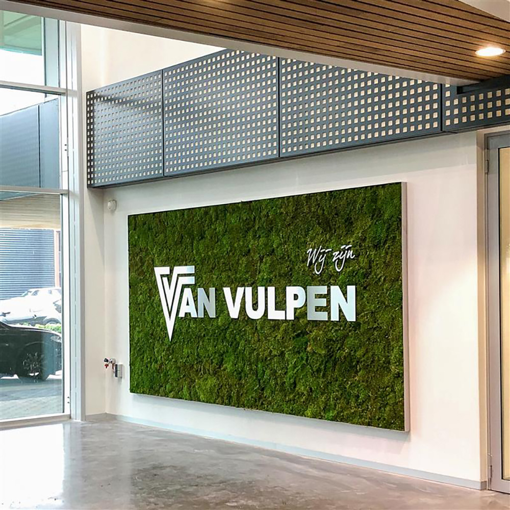 Maak kennis met deze unieke mosschilderijen. Op maat gemaakt met het mos van uw keuze en desgewenst met logo of beeldmerk. Een stijlvolle én functionele eyecatcher voor in het kantoorpand. Een mosschilderij is natuurlijke kunst voor aan de muur. Deze eyecatcher is bovendien functioneel: het mos absorbeert geluidsgolven en zorgt hierdoor voor minder geluidshinder en stresservaring. Dat draagt bij aan een betere focus en verhoogde productiviteit.